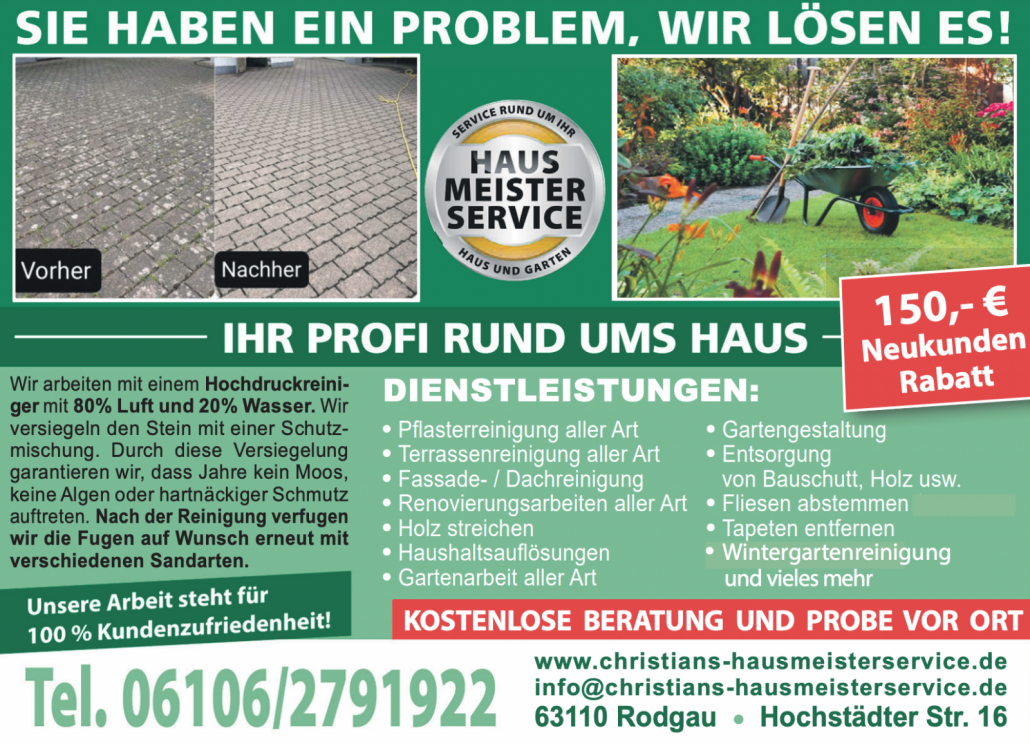 Überzeugen Sie sich selbst von unserem Service und lassen Sie uns Ihre Immobilie oder Außenanlage in Bestform bringen!